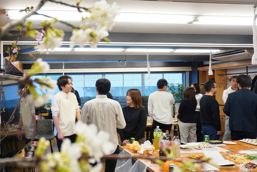 当日はあいにくの雨模様となり室内での開催へと変更になりましたが、会場内には桜の飾りが施され、春の訪れを感じさせる華やかな雰囲気となりました。イベントでは、美味しい食事とお酒を片手に、活発なコミュニケーションが交わされ、社員同士の交流が深まる貴重な時間となりました。