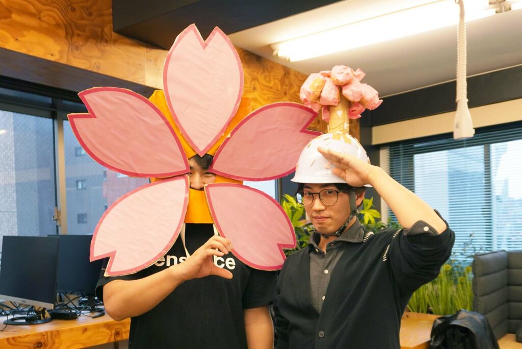 今年のお花見には、当社グループのコミュニティ事業を担い、仙台を拠点とするエンスペース株式会社のメンバーも駆けつけてくれました。さらに、エンスペースのメンバーがお花見を盛り上げるために桜の被り物を用意してくれるというサプライズも!