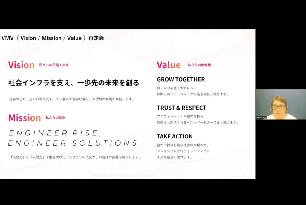 総会は代表取締役 CEOの吾郷克洋より、2025年度の振り返りと2026年度の経営方針・目標について、エンライズソリューションの現在地と目指すべき未来の説明を皮切りに、次のステージへ向けた明確なビジョンが全社員へ共有されました。